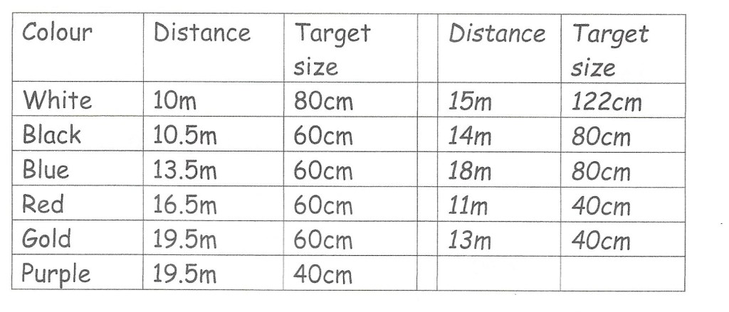 There is a large mental aspect to Archery, so if you can line up on a Club Night or at a tournament knowing that you can score 252 (see table below) at a chosen distance, then you should be able to feel confident in your ability to shoot a good round regardless of how little experience you may have.